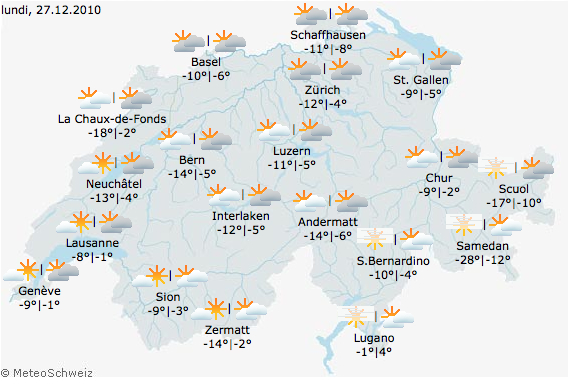MétéoSuisse predice aún más frío para esta noche aunque se espera que las temperaturas a partir de mañana 28 de diciembre sean un poco menos frías.