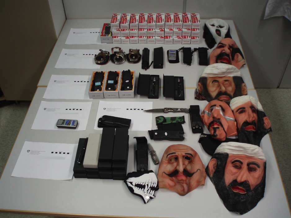 Fueron también decomisados un cuchillo y un batón retractables, un encendedor que escondía una navaja adentro, esposas, punteros láser, pasa-montañas y máscaras de uno de los personajes de la película Scream y de Osama bin Laden.