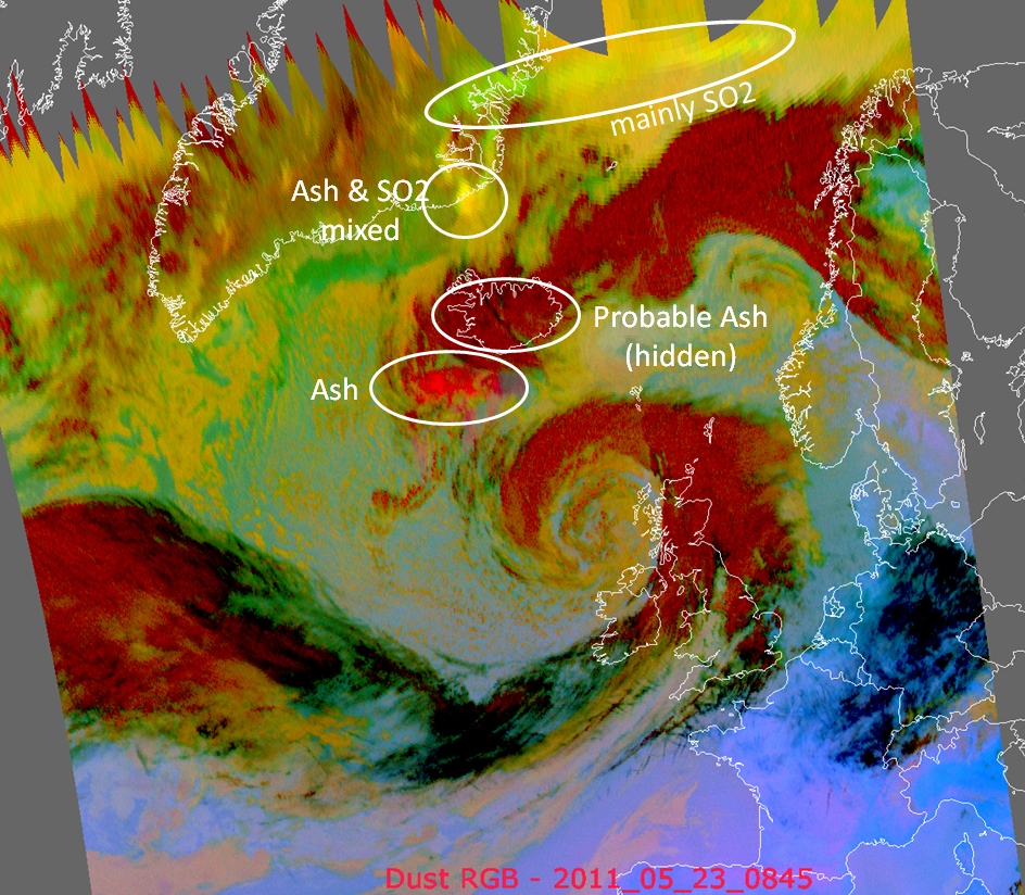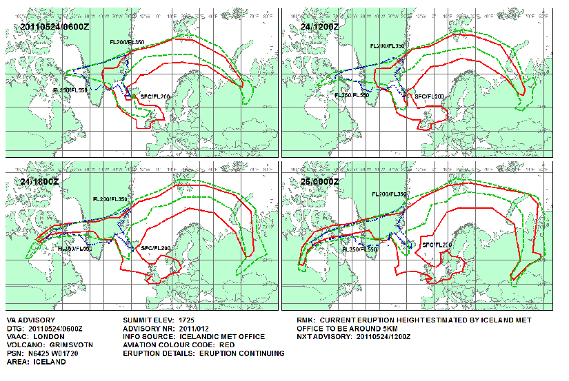 La dispersión de la nube volcánica puede verse hoy 24 de mayo a una altitud mayor de 6,000 metros al este de Groenlandia y a menor de 6,000m se dirige hacia las Islas de Shetland.
