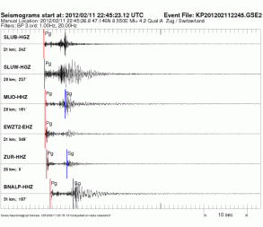 El terremoto se produjo el 11 de febrero de 2012 a las 23:45 y 26 segundos (hora local) y tuvo una magnitud de 4,2 en la escala de Richter. Es probable que este terremoto se haya sentido en toda Suiza.