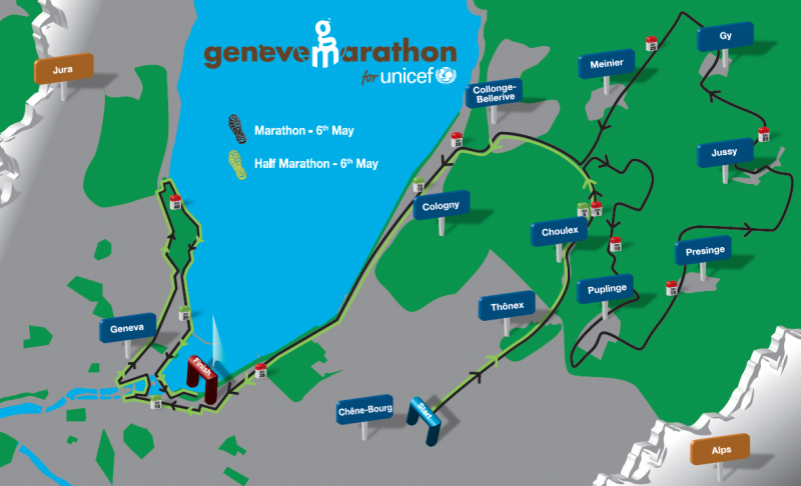 Los corredores de la maratón completa saldrán desde Chene-Bourg e irán hasta el Jardín Inglés, después de tomar un desvío a través de la campiña ginebrina.