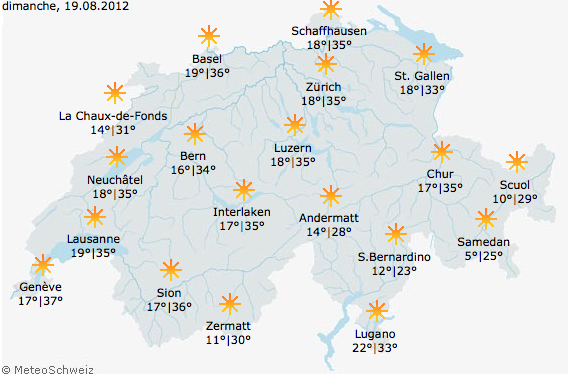 De acuerdo al servicio de meteorología de Suiza, MeteoSuisse, tras el paso de una breve perturbación en la mañana del jueves 16 de agosto, las temperaturas aumentarán con fuerza el viernes 17 debido a una alta presión proveniente del suroeste.