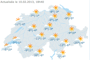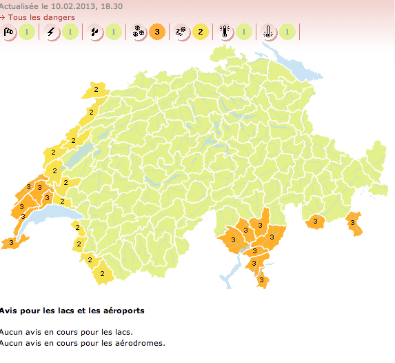 De la medianoche de hoy 10 de febrero a 19:00 de lunes al oeste de Suiza, y el lunes de 6:00 a las 12:00 del martes al sur de los Alpes.