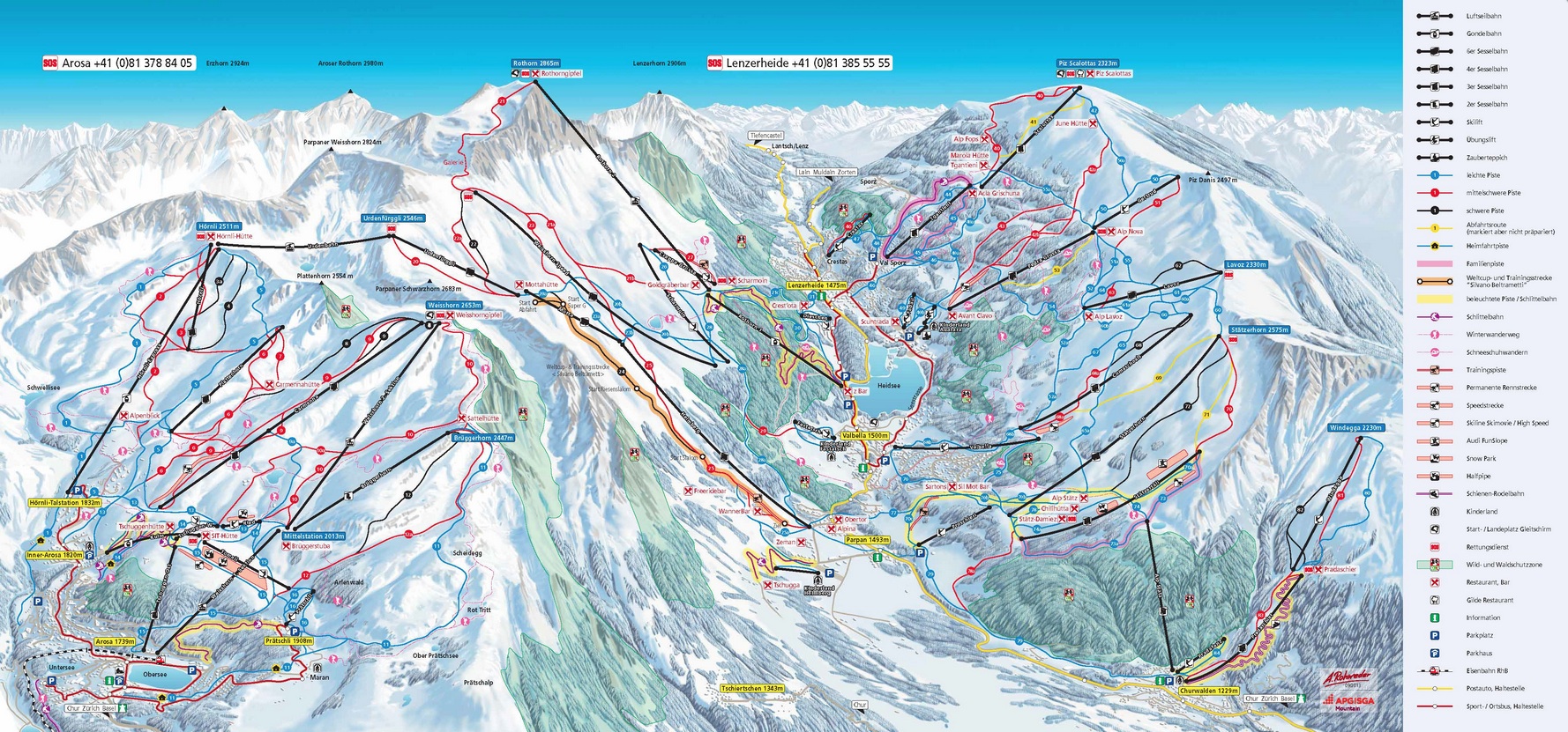 Arosa se encuentra en el extremo del Valle Schanfigg a 1.800 metros sobre el nivel del mar. Para los esquiadores y practicantes de snowboard hay 70 kilómetros de pistas preparadas, así como una zona de freeride de 30 kilómetros y un half-pipe. Existen además 13 remontes que llevan a los pasajeros a 2.653 metros de altura.