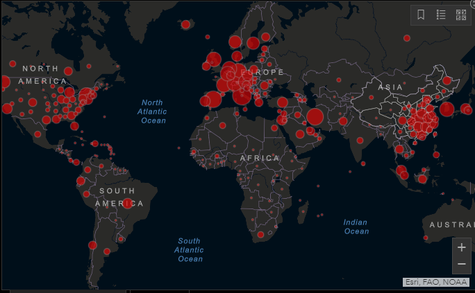 El Hospital John Hopkins en Estados Unidos ha puesto a disposición dos interesantes mapas interactivos de los cuales hemos extrapolado las imágenes en esta nota.